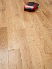 Nature Solid Oak flooring Natural Grade Oak Flooring has a width of 90mm and is 18mm thick. These boards come in random lengths ranging from 300mm to 1200mm. Each board is tongue and grove and has bevelled edges on all four sides.90mm solid Oak Natural is finished with 6 coats of UV Lacquer which gives this flooring a smooth and protective coating.The solid oak flooring Rustic Grade means this floor will come with Knots and colour variation for a natural looking floor surface. This floor can be installed by secret nailing to an existing wooden subfloor or by sticking down to a concrete subfloor.